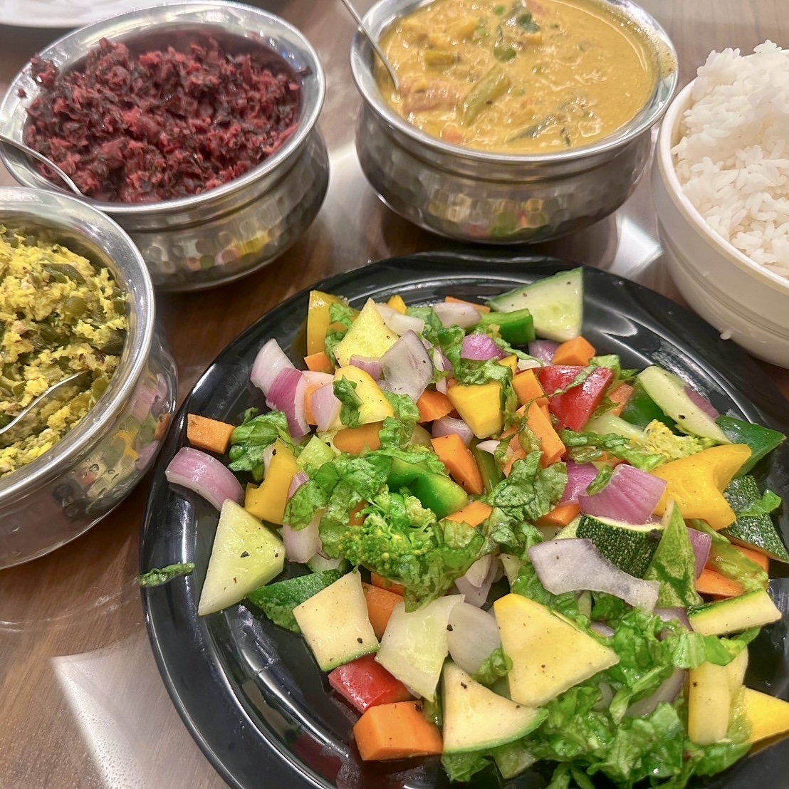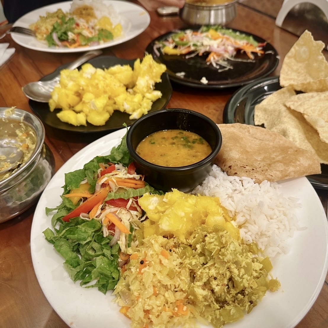 辛みスパイスの使用が少ない、ヨーガに適した食事を頂きますが、南インドならではの豊富なスパイスで味付けられた食事はとても美味しくいただけます。インド料理が辛いというイメージがある方でも、無理なく食べることの出来る食事です。ヨーガという生き方をする人にとってふさわしい食事を続けることで、心身に大きな変化をもたらすことに気づくと思います。